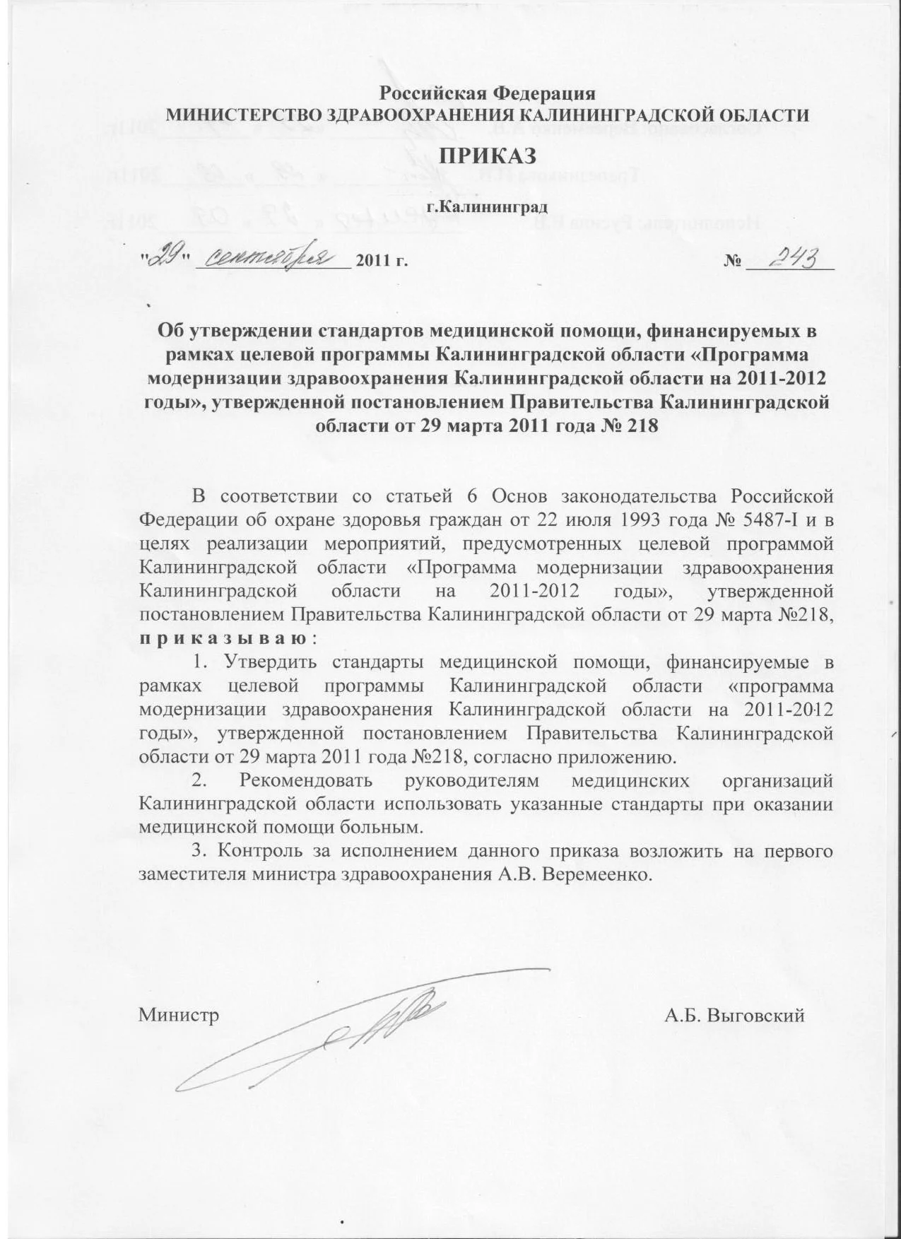 | Приказ Министерства здравоохранения Калининградской области от 29 сентября 2011 г. N 243 Опубликован 30.09.2011 |