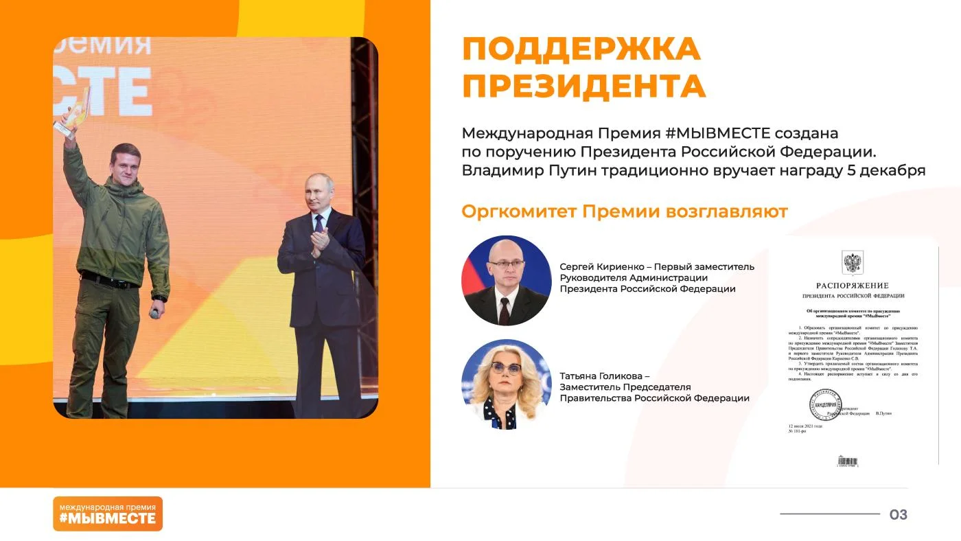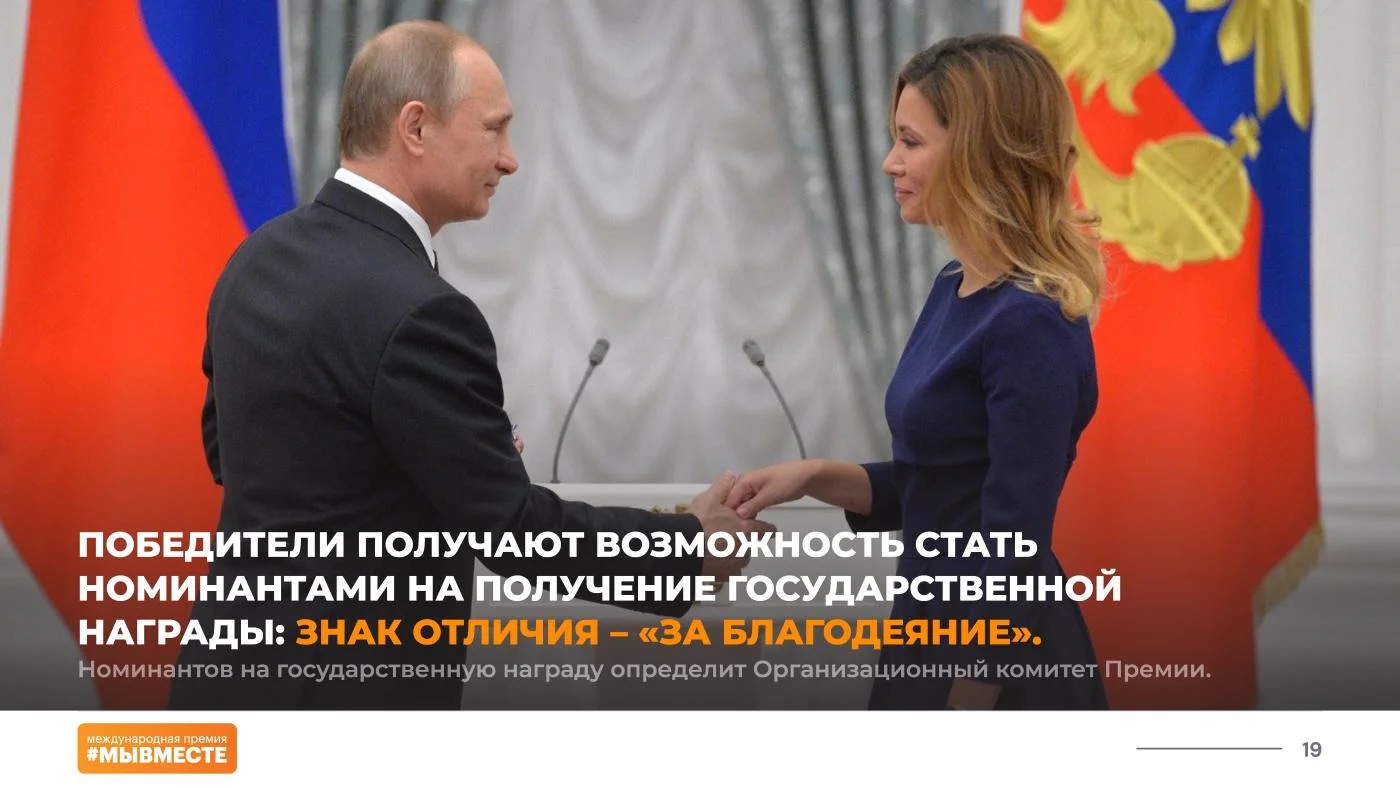 18 февраля стартовал третий сезон Международной Премии #МЫВМЕСТЕ 2023. Об этом объявили во время проведения Общероссийского семинара региональных штабов #МЫВМЕСТЕ, который проходит в Ростове-на-Дону. Цель Премии – поддержать значимые инициативы, направленные на помощь людям и улучшение качества жизни в России и мире. Она была запущена по поручению Президента России Владимира Путина.