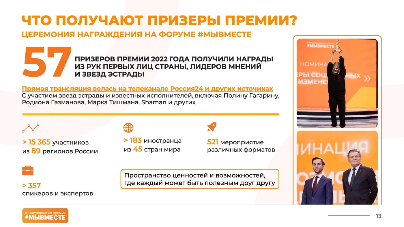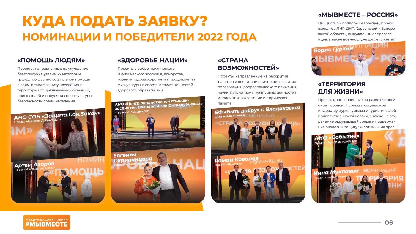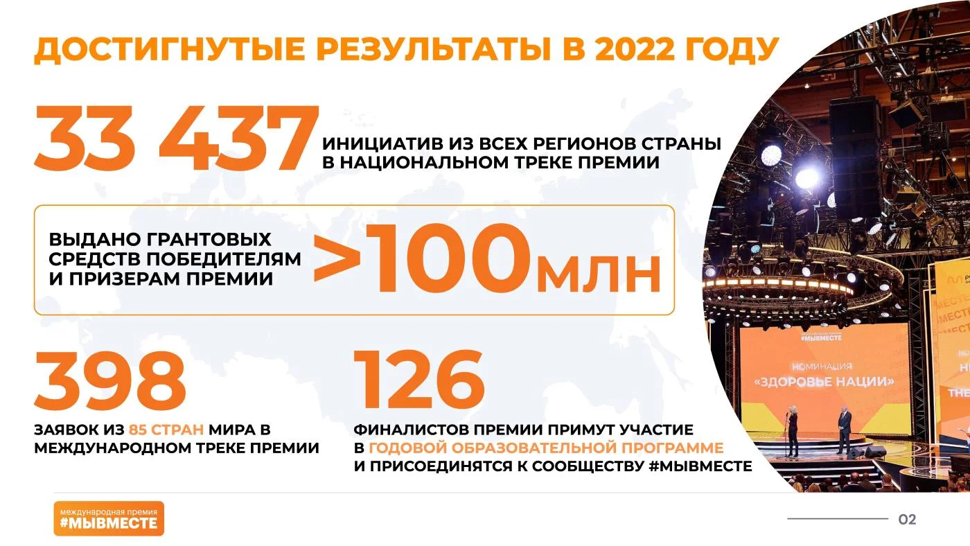 В 2022 году на Премии поступило более 30 тыс. заявок из всех регионов России. Церемония награждения, на которой лауреатов поздравил Президент России Владимир Путин, прошла 5-7 декабря в московском Центральном выставочном зале Манеж на Международном форуме гражданского участия #МЫВМЕСТЕ.