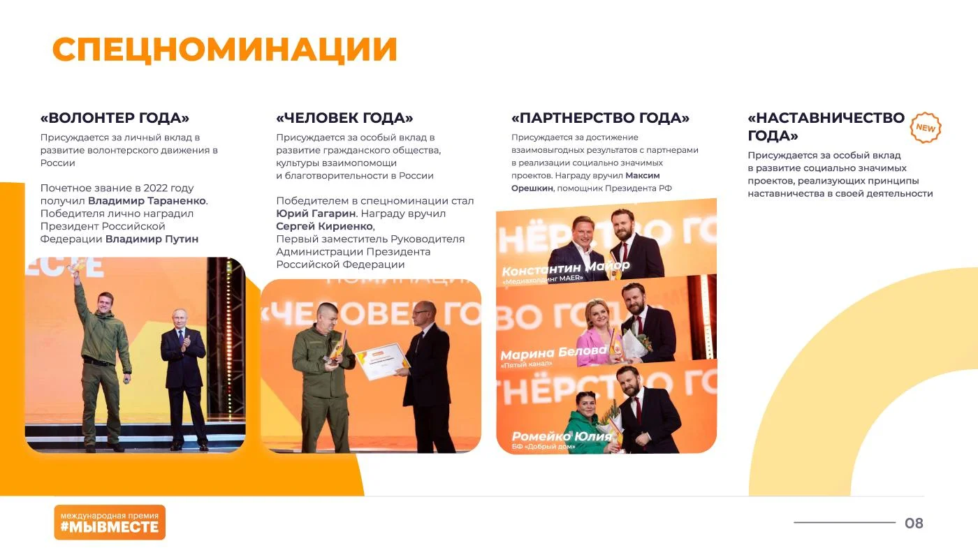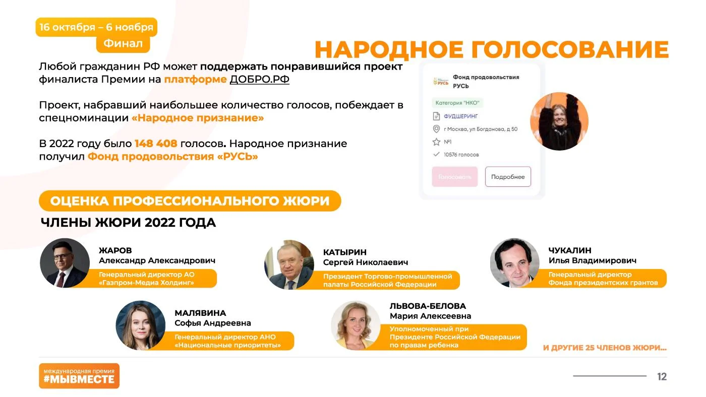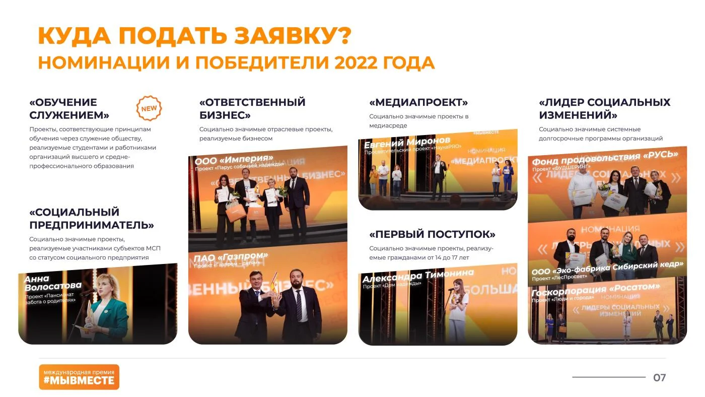 В 2022 году на Премии поступило более 30 тыс. заявок из всех регионов России. Церемония награждения, на которой лауреатов поздравил Президент России Владимир Путин, прошла 5-7 декабря в московском Центральном выставочном зале Манеж на Международном форуме гражданского участия #МЫВМЕСТЕ.