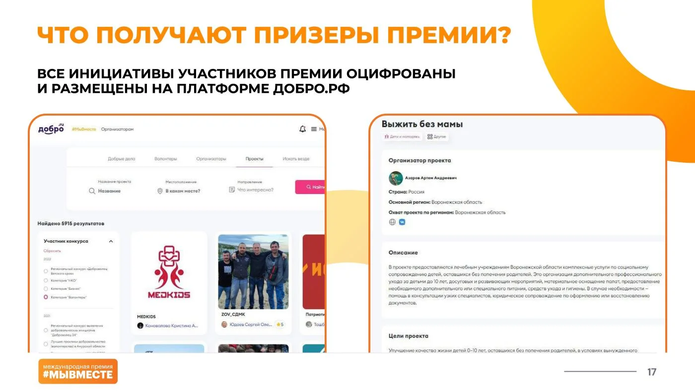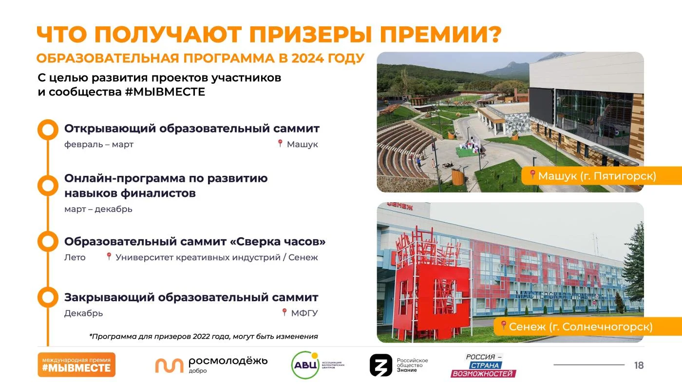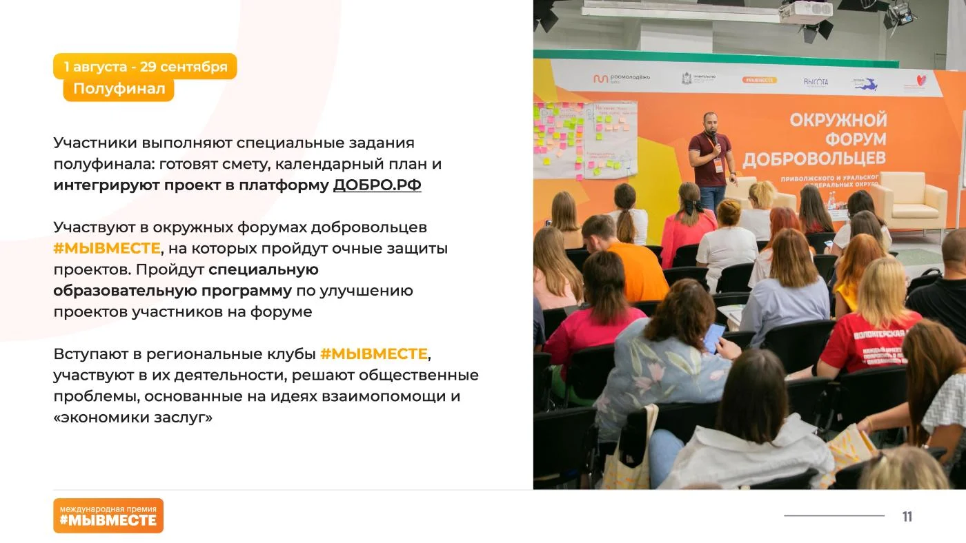 «Полуфинал Премии пройдёт в формате очной защиты на окружных форумах добровольцев #МЫВМЕСТЕ, – добавляют организаторы. – Участники получат уникальную возможность пройти специальную образовательную программу и улучшить свои проекты, применив на практике советы от федеральных экспертов».