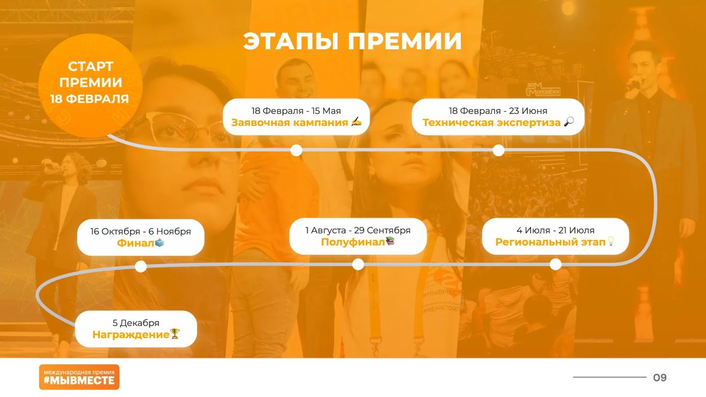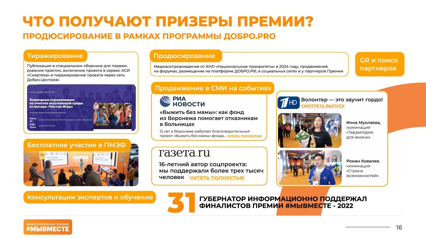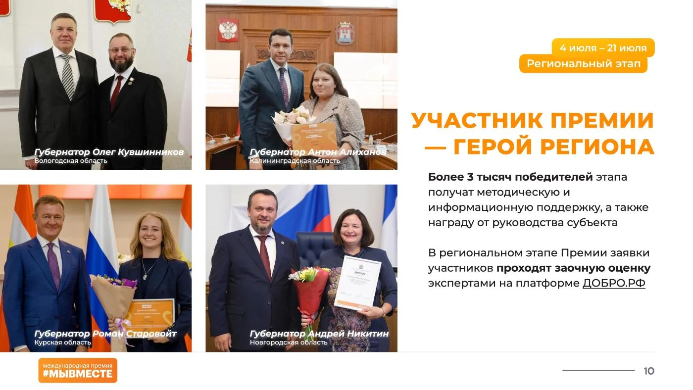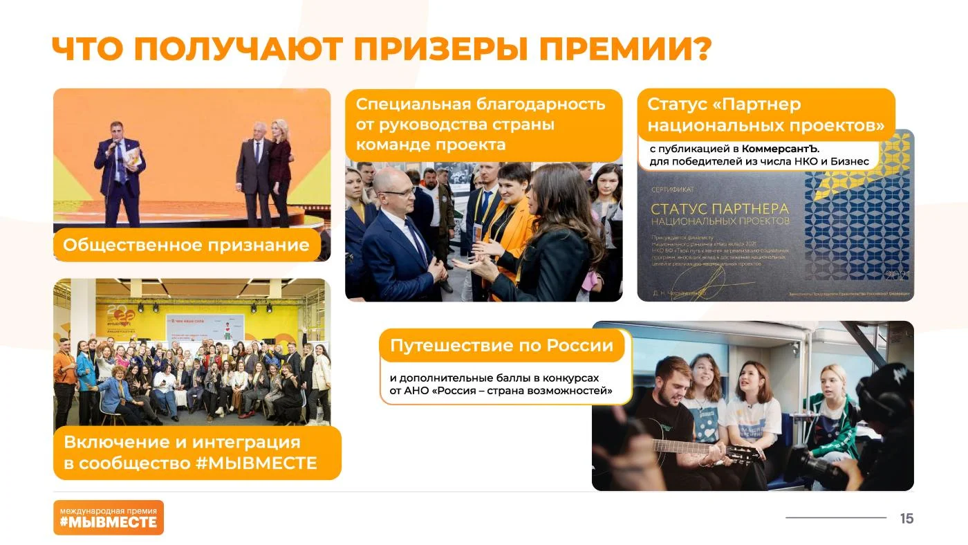 «Полуфинал Премии пройдёт в формате очной защиты на окружных форумах добровольцев #МЫВМЕСТЕ, – добавляют организаторы. – Участники получат уникальную возможность пройти специальную образовательную программу и улучшить свои проекты, применив на практике советы от федеральных экспертов».