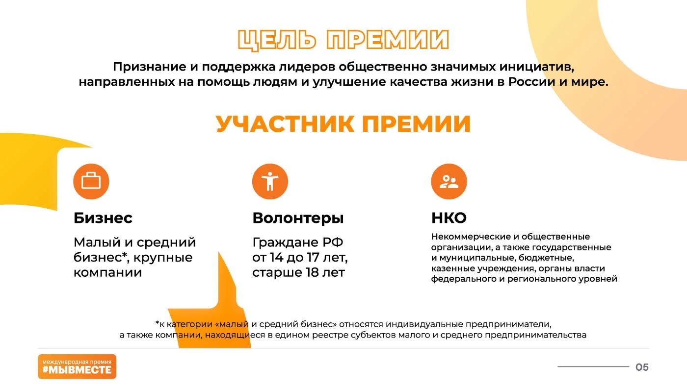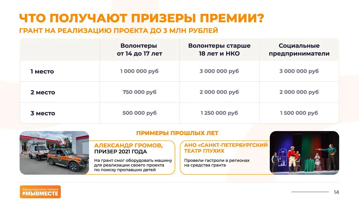 Участниками могут стать российские и иностранные граждане старше 14 лет, НКО, учреждения, представители бизнеса и медиасферы, реализующие общественные инициативы.