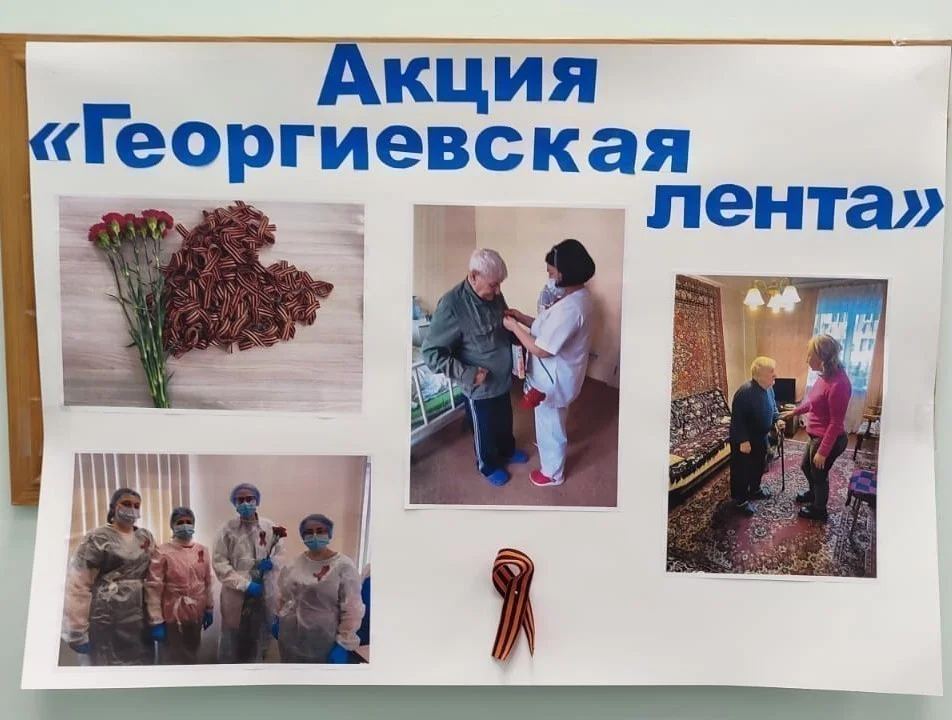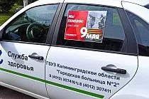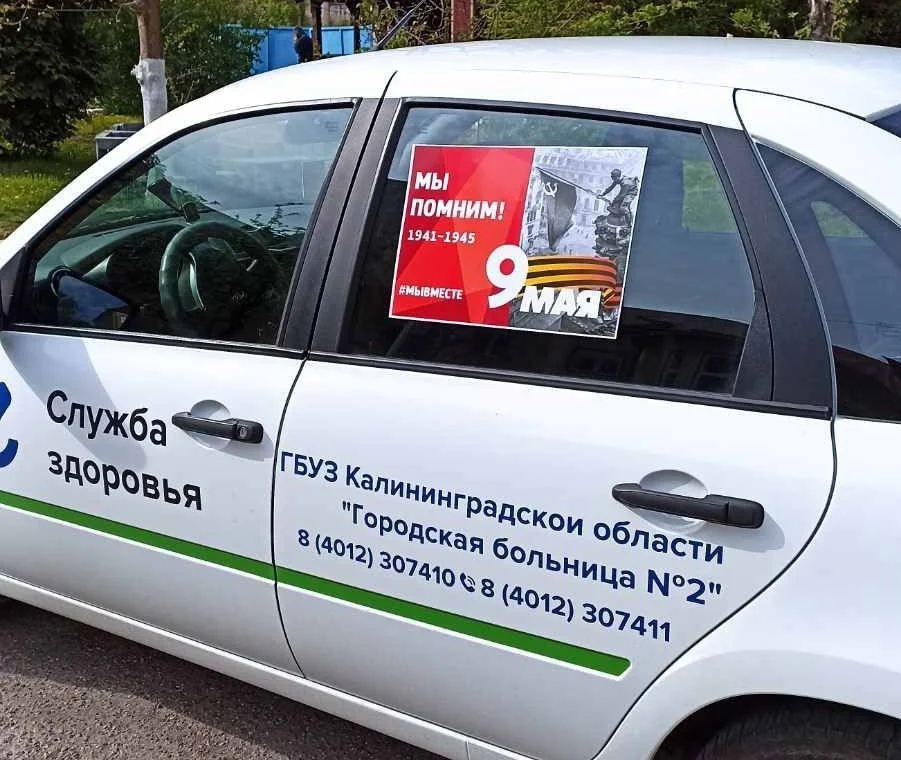 Символика, посвященная Дню Победы, размещена на санитарном автотранспорте. В этом году тематические плакаты на автомобилях разместили Городская станция скорой медицинской помощи, Городская больница №2, больницы муниципалитетов. В нескольких стационарах на территории Калининградской области была организована раздача георгиевских ленточек пациентам.