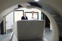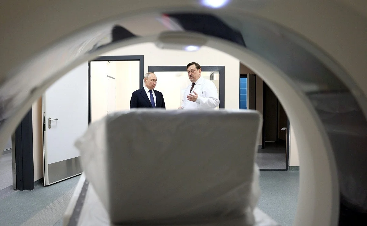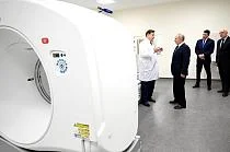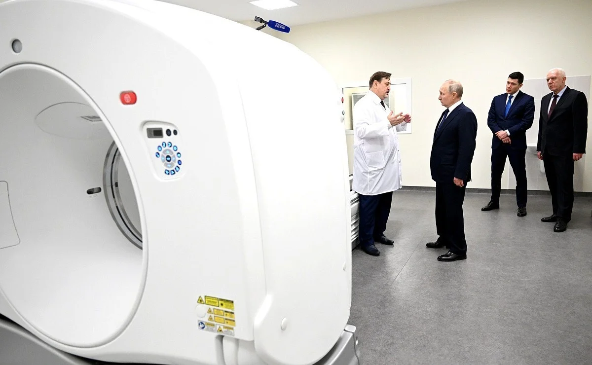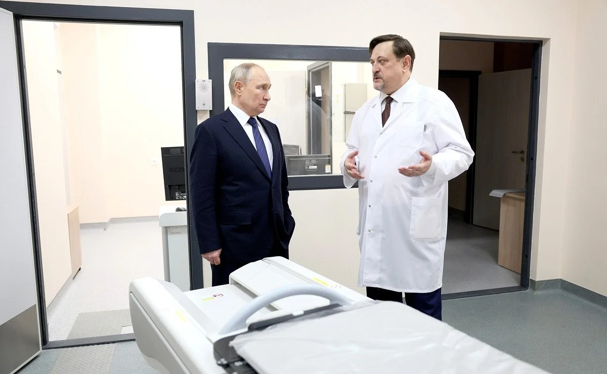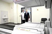 И.о. главного врача Кирилл Баринов продемонстрировал Владимиру Путину диагностический блок – кабинеты компьютерной и магнитно-резонансной терапии, ОФЭКТ/КТ, радиотерапевтическое отделение с одним из двух имеющихся линейных ускорителей.