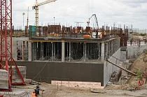 По словам представителя генподрядчика, на стройплощадке сегодня трудятся 360 человек, в том числе на первом, самом большом, блоке – в ночную смену, и в ближайшее время их число будет увеличиваться. В возведении объекта участвуют 14 единиц техники. Полностью завершен нулевой цикл, сейчас на каждом блоке выполняется гидроизоляция. На первом и третьем блоках возводится первый этаж, на втором, четвертом и пятом блоках – второй. Также идет завершение согласования по отделочным материалам для фасада.
